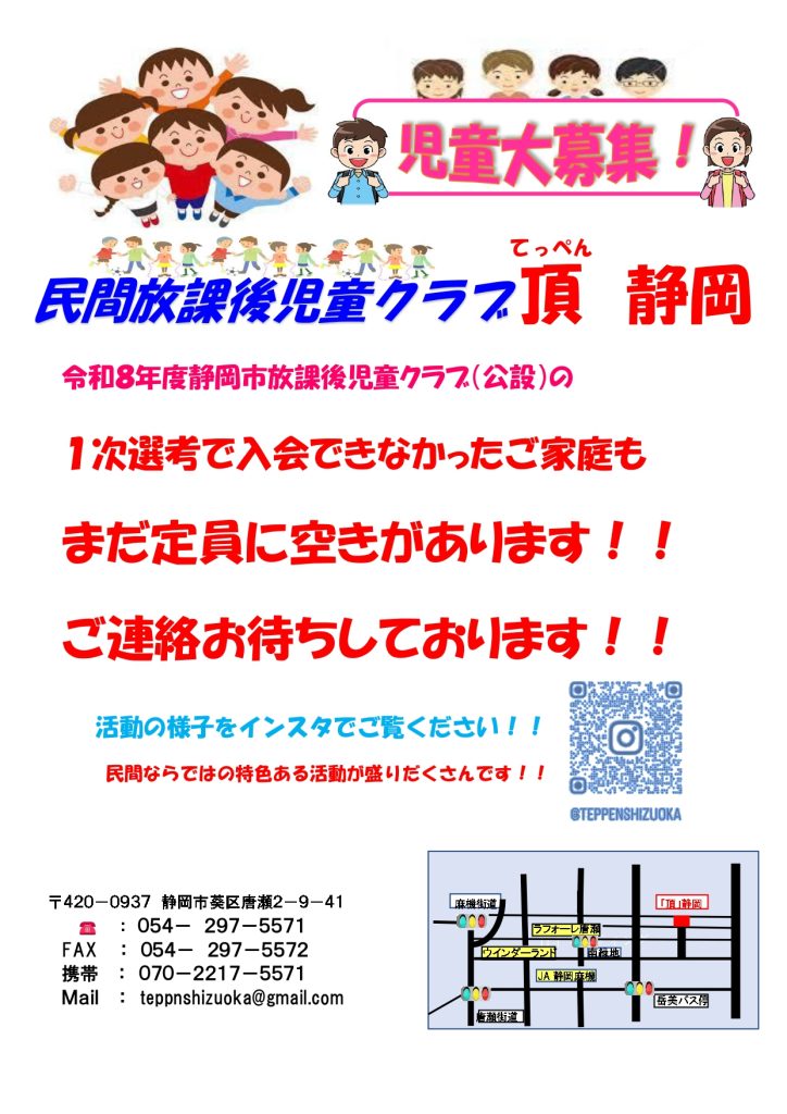 その問題を解消する為に、民間放課後児童クラブ「頂静岡」がございますので、御利用のご案内をさせて頂きます。